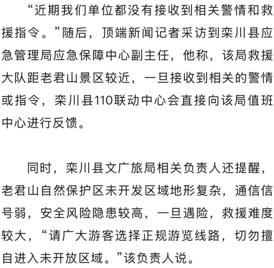 12月15日19时许,顶端新闻记者从栾川县文化广电和旅游局(简称:栾川县文广旅局)获悉,经应急、公安、消防等多部门进行全面核查,该县域各景区未发生网传人员意外死亡事件,网传信息不属实。