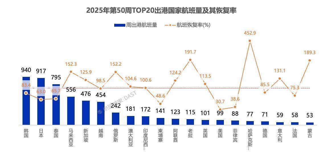 TOP20出港国家中,赴韩国航班量超日本居第一。日本、泰国、柬埔寨、美国、菲律宾航班量恢复率在七成以下,日本恢复率降至63.0%;赴马来西亚、新加坡、俄罗斯、澳大利亚、印尼、阿联酋、老挝、英国、哈萨克斯坦、意大利、蒙古恢复率超100%。