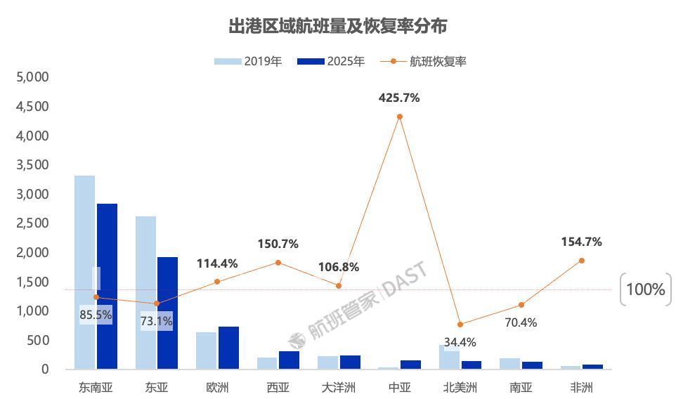 过去一周,赴欧洲、西亚、大洋洲、中亚及非洲的航班量超2019年,赴大洋洲区域的航班恢复至2019年的106.8%。